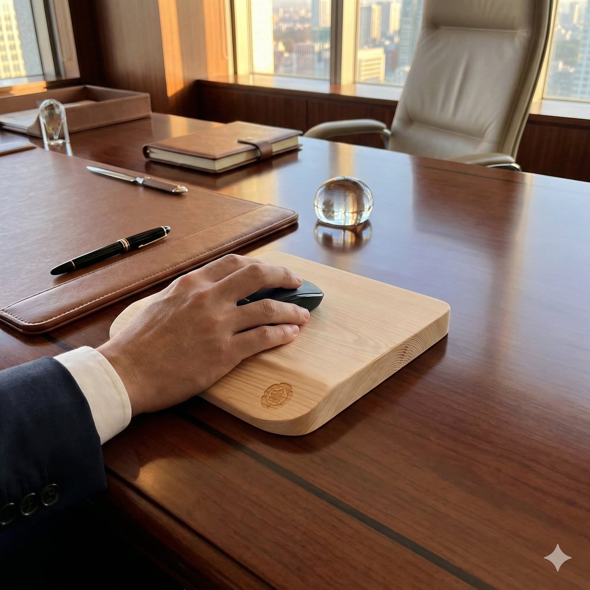 A. 多くの木製マウスパッドは、木目のデザインや硬さだけを重視したシンプルな構造ですが、本製品は「デスクに置く象徴的な道具」として設計されています。椅子が立場を示すように、マウスパッドがその存在を示す。そんな思いで設計されています。