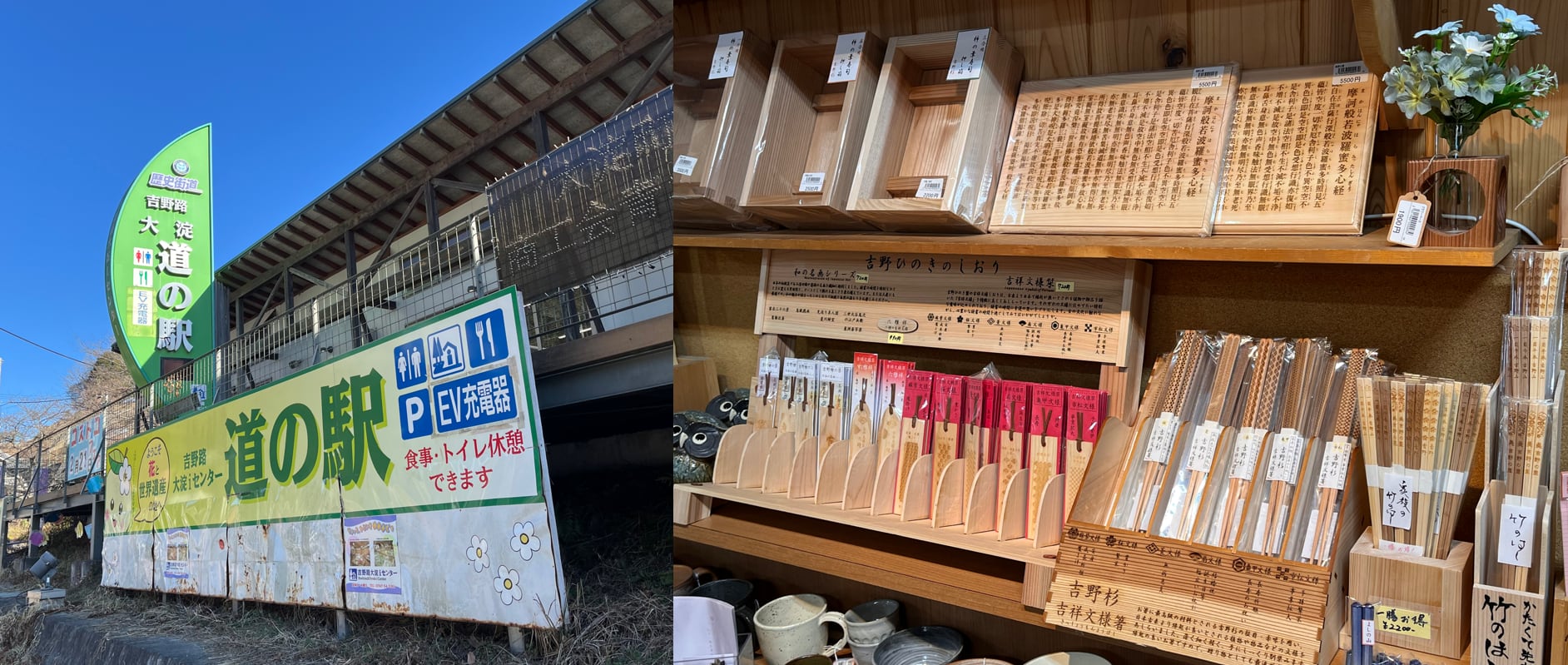 地元吉野のお土産品を販売する売店にて、吉野檜、吉野杉を使った商品(お箸、しおりなど)を販売しています。